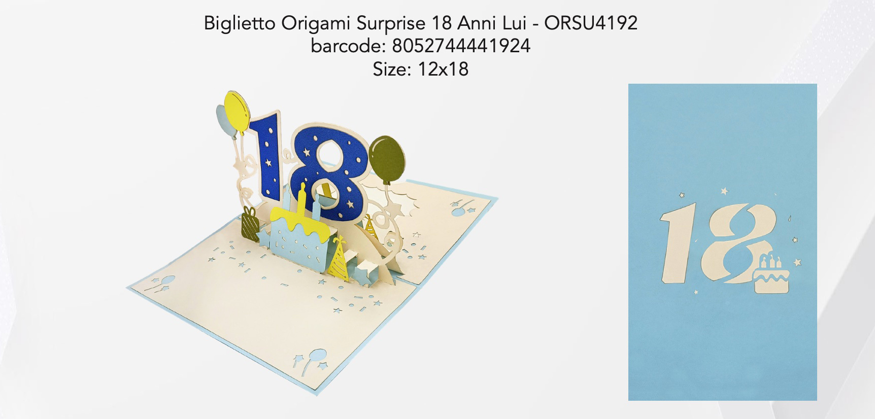 Biglietto Origami 18 Anni lui 12×18 cm, Pop Up tridimensionale. Materiale: carta. Simpatici biglietti con soggetti originali e spiritosi per fare i vostri auguri in modo creativo. Il soggetto del biglietto resta piegato dentro la busta fino a che non si apre. A quel punto si solleva e si compone nella sua forma tridimensionale. Si compone di una busta e di un cartoncino.