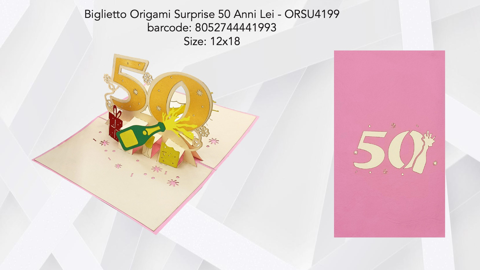 Biglietto Origami 50 Anni lei 12×18 cm, Pop Up tridimensionale. Materiale: carta. Simpatici biglietti con soggetti originali e spiritosi per fare i vostri auguri in modo creativo. Il soggetto del biglietto resta piegato dentro la busta fino a che non si apre. A quel punto si solleva e si compone nella sua forma tridimensionale. Si compone di una busta e di un cartoncino.