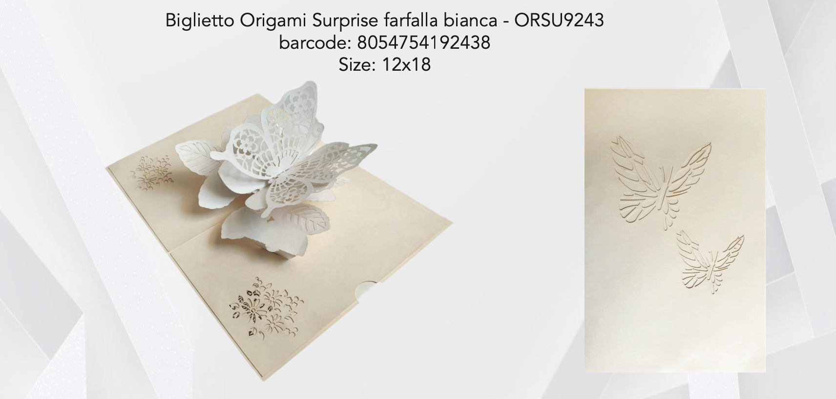 Biglietto Origami Farfalla bianca 12×18 cm, Pop Up tridimensionale. Materiale: carta. Adatto a qualsiasi tipo di augurio. Simpatici biglietti con soggetti originali e spiritosi per fare i vostri auguri in modo creativo. Il soggetto del biglietto resta piegato dentro la busta fino a che non si apre. A quel punto si solleva e si compone nella sua forma tridimensionale. Si compone di una busta e di un cartoncino.