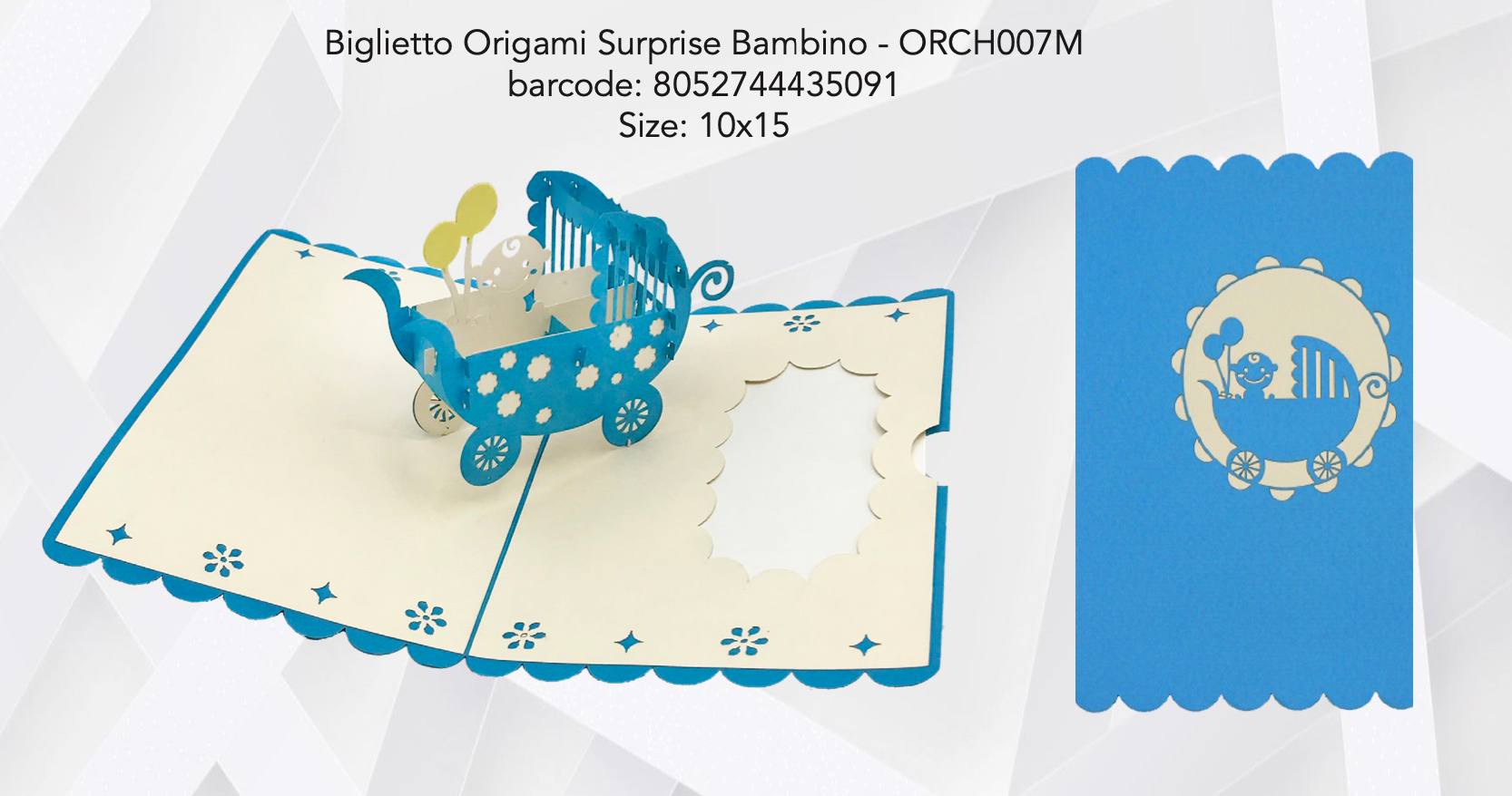 Biglietto Origami Nascita bambino 10×15 cm, Pop Up tridimensionale. Materiale: carta. Adatto per la nascita. Simpatici biglietti con soggetti originali e spiritosi per fare i vostri auguri in modo creativo. Il soggetto del biglietto resta piegato dentro la busta fino a che non si apre. A quel punto si solleva e si compone nella sua forma tridimensionale. Si compone di una busta e di un cartoncino.