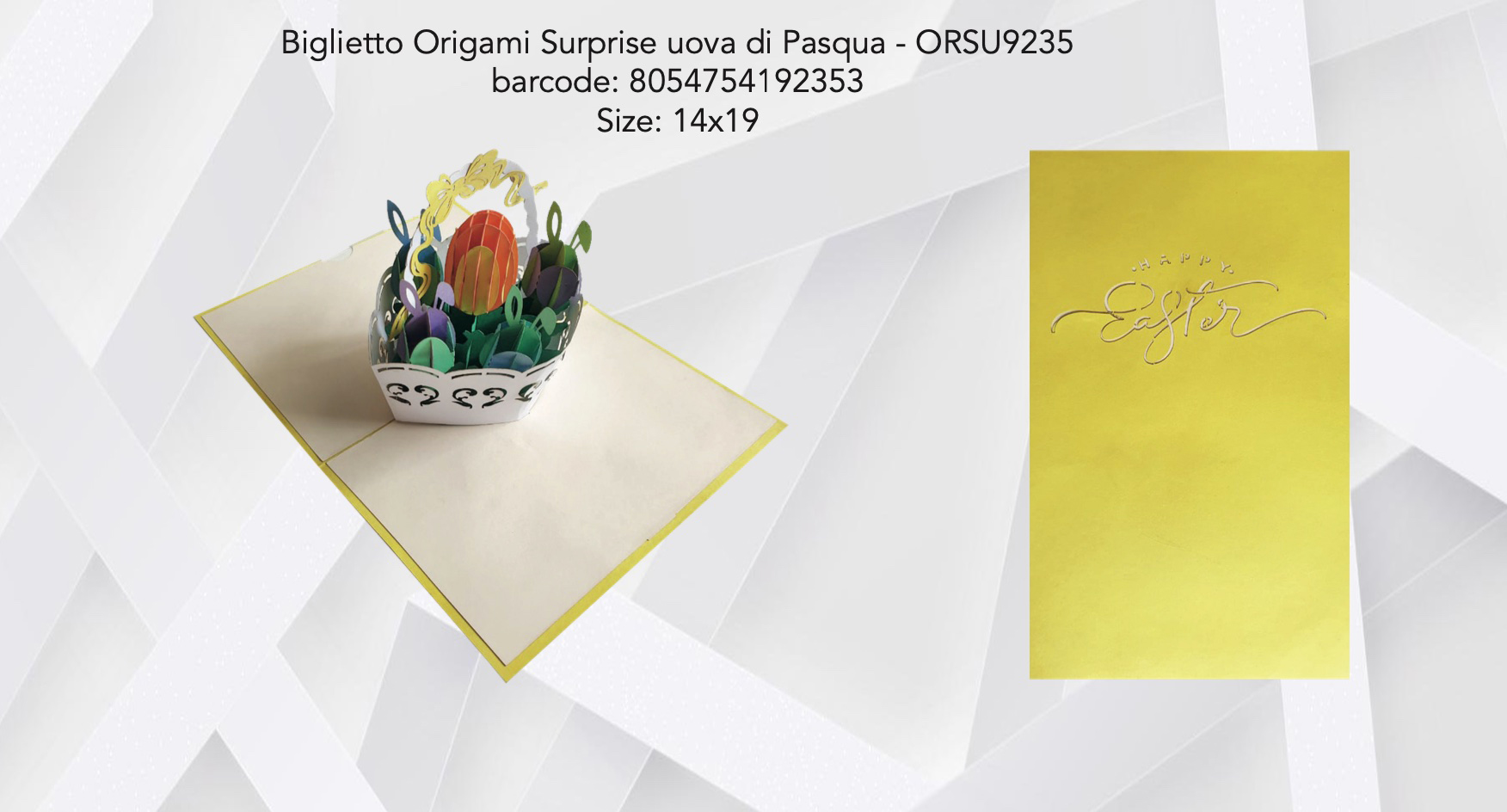 Biglietto Origami Uova di Pasqua 14×19 cm, Pop Up tridimensionale. Materiale: carta. Simpatici biglietti con soggetti originali e spiritosi per fare i vostri auguri in modo creativo. Il soggetto del biglietto resta piegato dentro la busta fino a che non si apre. A quel punto si solleva e si compone nella sua forma tridimensionale. Si compone di una busta e di un cartoncino.